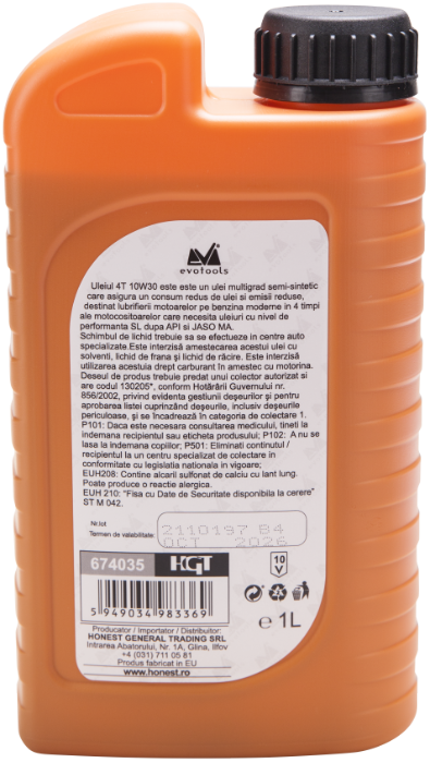 Óleo semi-sintético de qualidade 10W30 para motores a gasolina de 4 tempos.